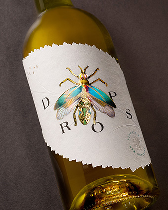 - DROPS WSA PCR-FSC (100% recycled fibers) – Designed for high-quality wine and spirits labeling applications, this label material features an accentuated uneven, textured surface combining a translucent effect and enhanced tactility, thanks to it having undergone a unique paper-making process. Estudio Maba used this material to create the spirits bottle label design.