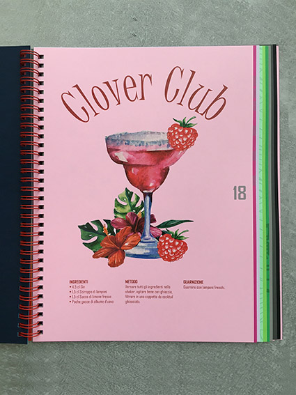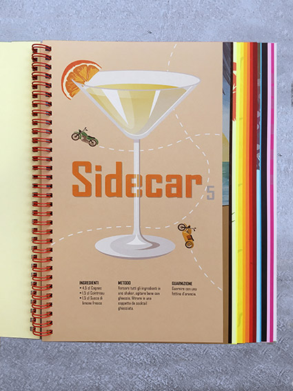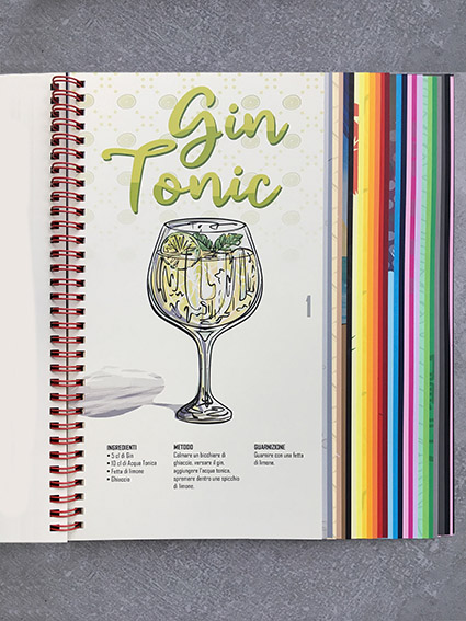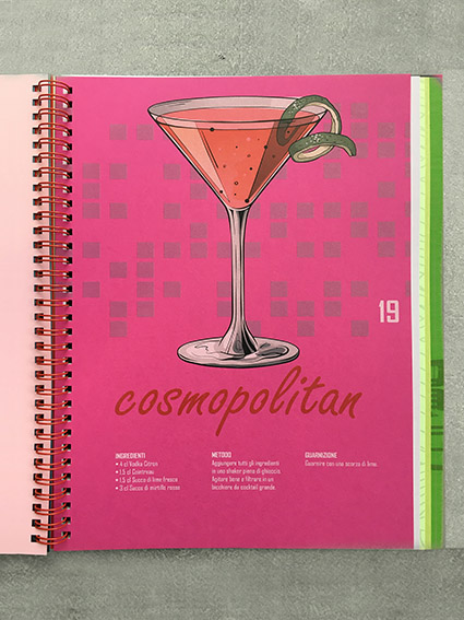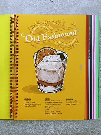 Per definire e presentare al meglio i 26 colori di Fizz, Polyedra si è ispirata ad altrettanti cocktail, creando uno strumento di comunicazione finalizzato alla loro presentazione ribattezzato Drinking Colours. Questo “lookbook” è costituito da un mix tra un visual, un campionario e un ricettario: di formato 22×28 (l’A4 americano), verticale, contiene infatti un esempio stampato di tutti i colori disponibili nella grammatura 170g, una campionatura di tutte le grammature, la tabella della gamma e una descrizione delle caratteristiche della carta. Ciascun colore ha una identità visiva, studiata ad hoc per rappresentare il cocktail corrispondente, di cui viene anche fornita la ricetta e la modalità di preparazione. Completa il prodotto editoriale una rilegatura a spirale metallica di colore rosso.