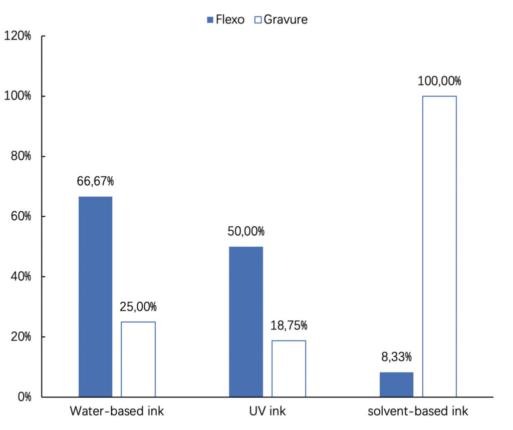 Anche gli inchiostri hanno un peso significativo: mentre gli inchiostri a base solvente sono ancora prevalenti nella rotocalco, la flessografia mostra un’adozione più diffusa di inchiostri a base acqua (66,7%) e UV (50%), entrambi caratterizzati da emissioni molto contenute di COV.