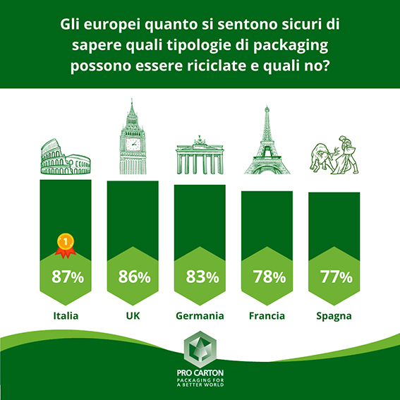 Per quanto riguarda la conoscenza sui materiali riciclabili, l’87% degli italiani si sente sicuro di sapere quali tipologie di packaging possono essere riciclate e quali no. I consumatori italiani sono i più preparati d’Europa, dichiarando di sentirsi più sicuri nel riciclare materiali come il cartone ondulato (89%), la carta e il cartone (86%) e il vetro (86%). È la prima volta che la carta e il cartone raggiungono percentuali più alte del vetro. Suscitano meno sicurezza i prodotti e i packaging in plastica.