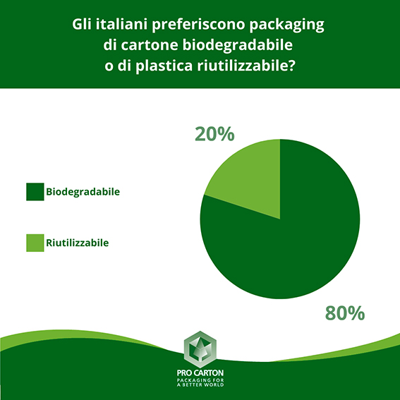La preferenza per i materiali biodegradabili è evidente: l’80% degli italiani preferisce che i brand sviluppino packaging biodegradabili di cartone che saranno riciclati, contro il 20% che preferisce packaging di plastica riutilizzabili.