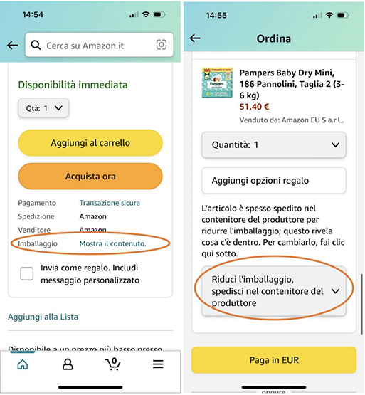 Cibo per animali, carta igienica e attrezzatura da giardinaggio sono esempi di prodotti che verrebbero ricevuti senza problemi nel loro packaging originale, mentre per quanto riguarda articoli per la cura della persona e oggetti di alto valore si preferirebbe fossero celati. Dal 2021, Amazon ha aumentato di oltre il 50% il numero degli ordini spediti ai clienti italiani senza packaging aggiuntivo da spedizione.