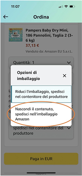 I clienti che desiderano celare gli ordini possono farlo selezionando la voce “Nascondi il contenuto, spedisci nell’imballaggio Amazon” dal menu a tendina disponibile per gli articoli certificati per essere spediti senza imballaggi da consegna aggiuntivi.